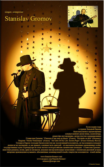 Stanislav Gromov's beautiful voice possesses a "velvety" timbre capable of performing various styles of vocal works (ranging from traditional urban romance to symphonic jazz and jazz-rock...) in basso profundo, baritone and low tenor.